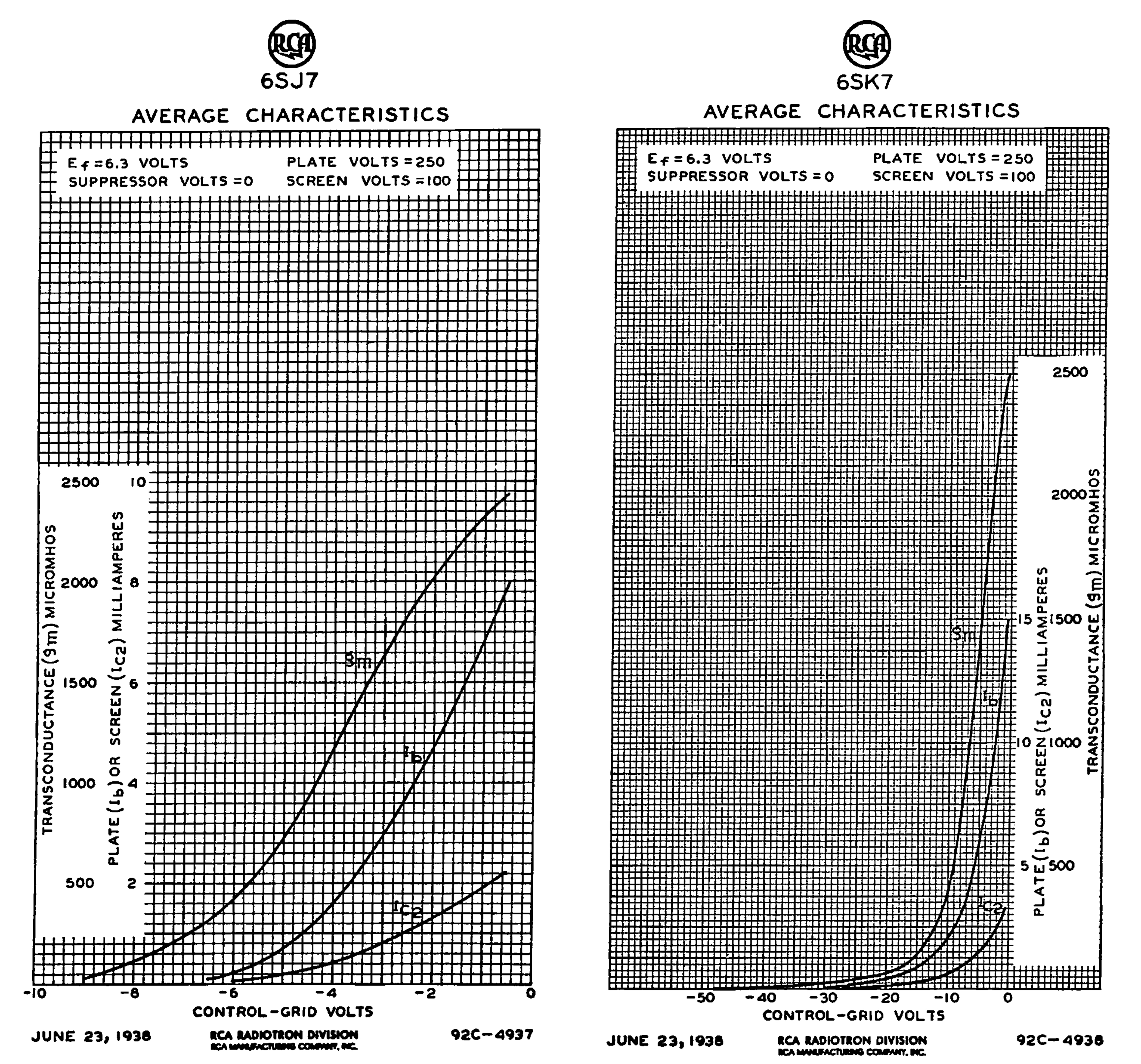 The difference between a conventional tube and a control tube can be seen in Figure 4. In the 6SJ7 tube, the current cuts off at a grid bias voltage about five times smaller than in the 6SK7 tube. The characteristic curve of the control tube is very nonlinear, and therefore is not suitable for an audio-frequency amplifier. In radio receivers, the grid bias voltage is changed according to the radio station being received, and the nonlinearity is beneficial, because the transconductance changes along the entire curve, and the current does not cut off. At radio frequencies, the distortion caused by nonlinearity is insignificant, because the tube's load is a tank circuit. However, if remote-cutoff tubes are used as audio amplifiers, then the push-pull circuit operates linearly.