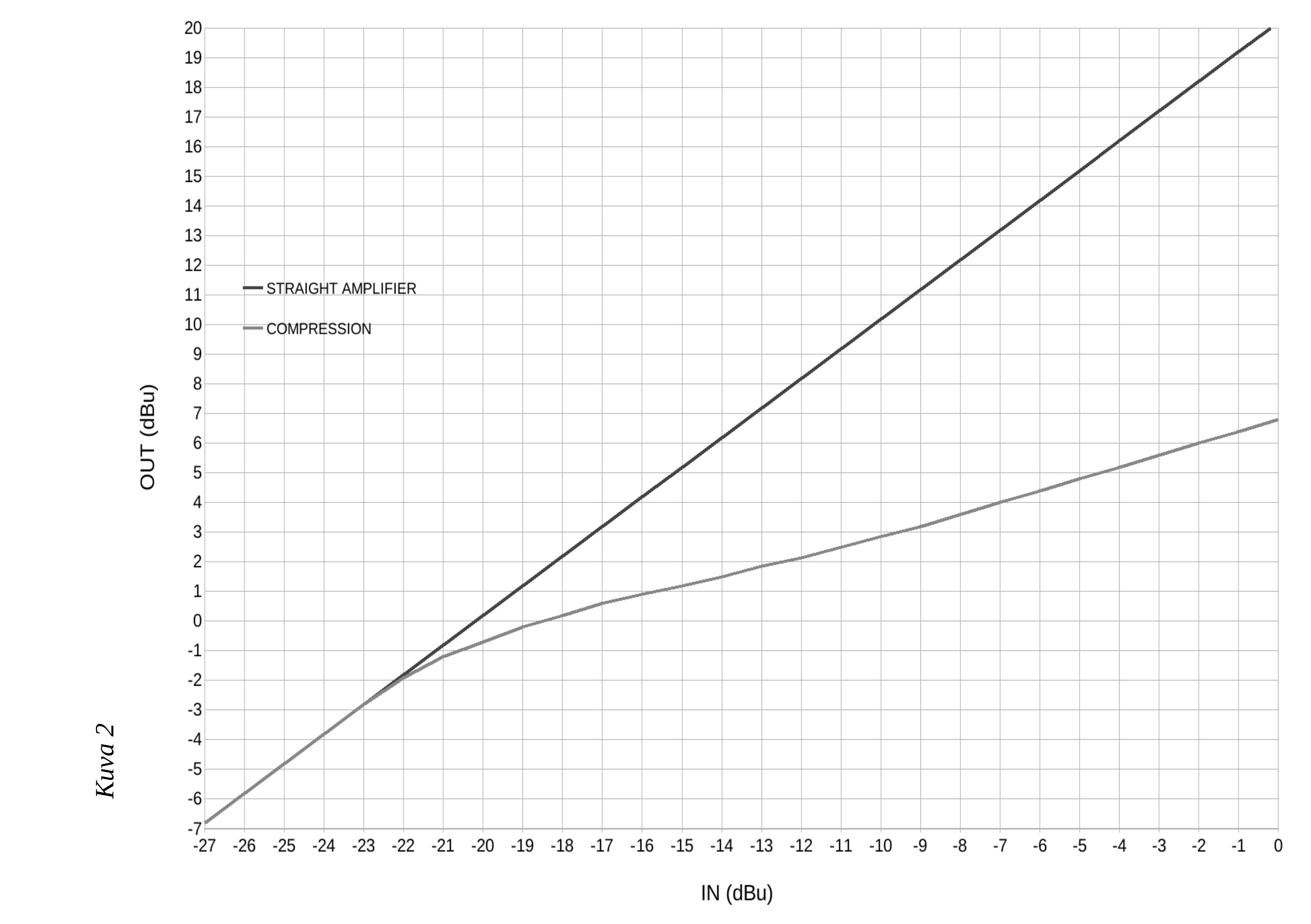 Figure 2 shows an example of the input/output characteristic curve of the compressor. Until the signal exceeds the threshold, the compressor behaves like a linear amplifier; beyond that point, compression begins and the amplifier’s gain falls. It is also common for tube compressors to have a compression ratio that varies with the amount of compression. Therefore, the ratio of the compression slope is gradually softer (soft knee).