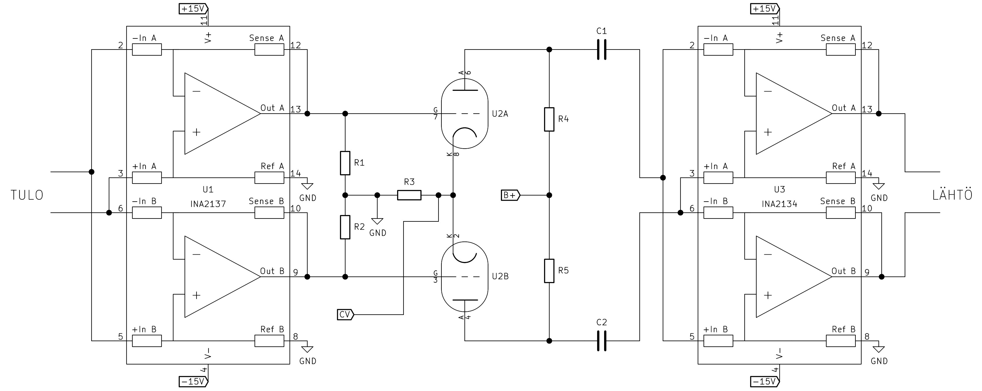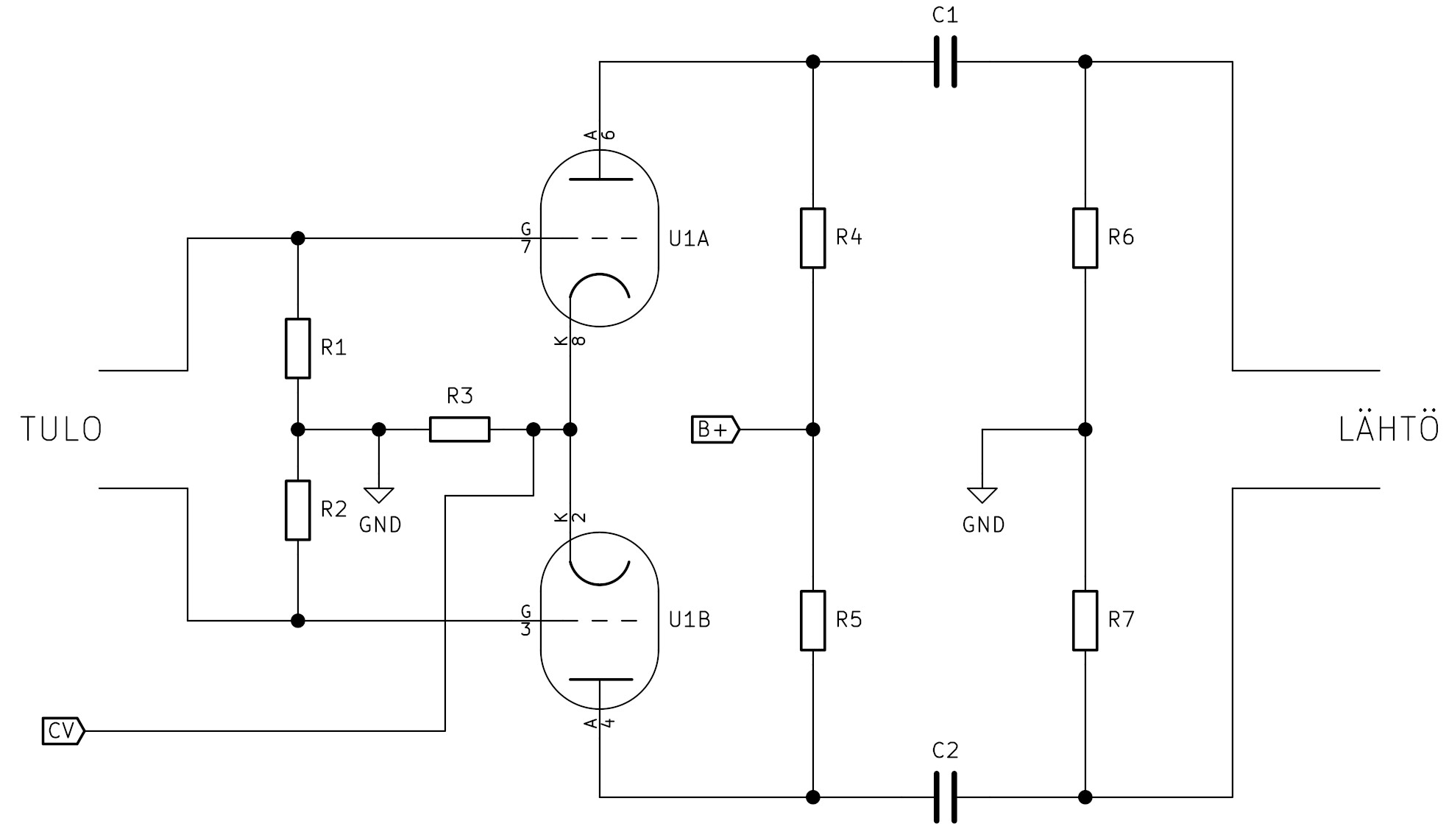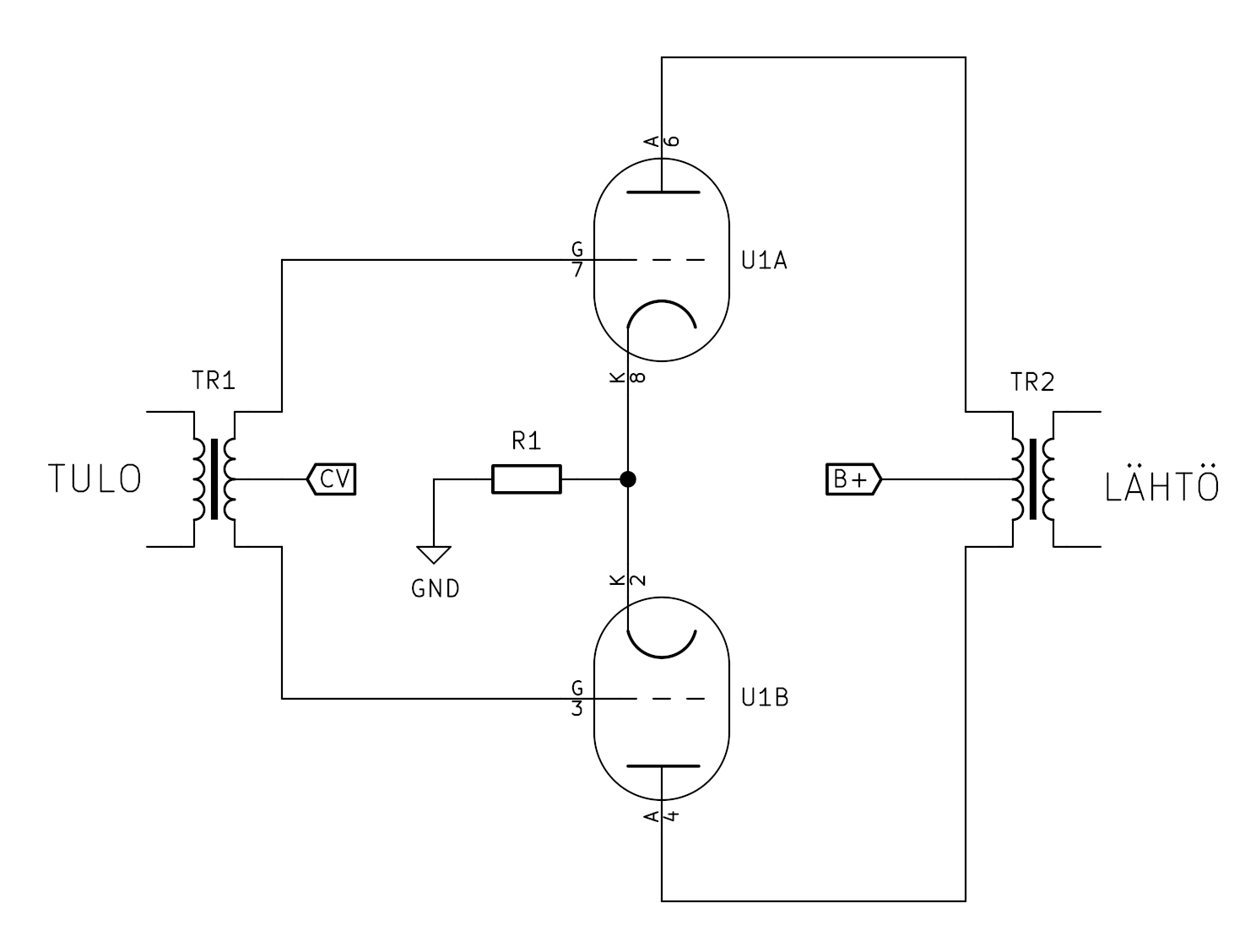 In Figure 8, a symmetrical audio signal is fed to the grids without a transformer, and the control voltage is fed to the cathodes.