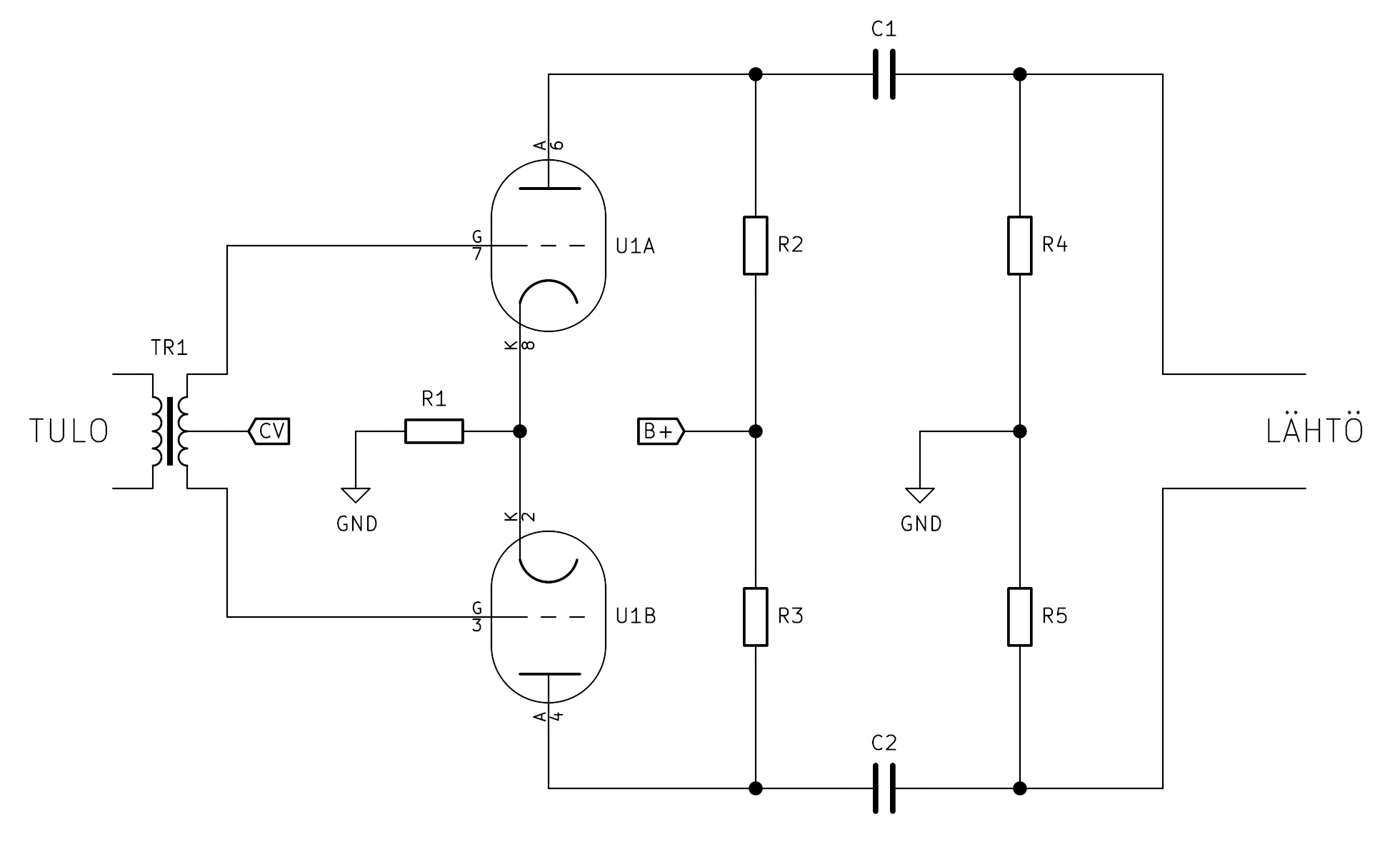 The output transformer TR2 is perhaps the most demanding part of a tube compressor. In the transformer's primary, the source resistance and the inductive reactance of the primary form a voltage divider. As the frequency decreases, the reactance decreases, and the voltage in the primary decreases. At the frequency where the inductive reactance and the source resistance are equal, the signal is attenuated by 3dB. The anode resistance increases as the anode current decreases, and the transformer's primary inductance must be large enough so that low frequencies are not attenuated during compression. The transformer must also tolerate DC current in the primary, otherwise the transformer core will saturate and the inductance will drop if the tubes are unbalanced.