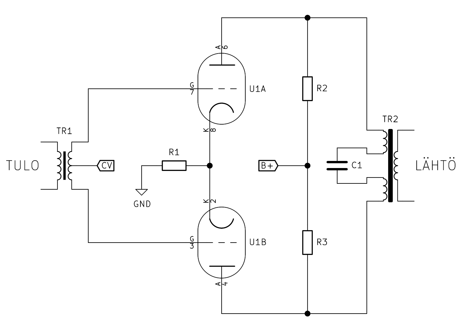 In Figure 6, DC current is kept out of the transformer using capacitor C1. By keeping DC current out of the transformer, even a poor balance of the tubes will not cause attenuation of low frequencies. The anode resistors R1 and R2 determine the maximum source resistance with which the transformer is driven. In this circuit, the load seen by the tube is the transformer's reflected load in parallel with the anode resistor.